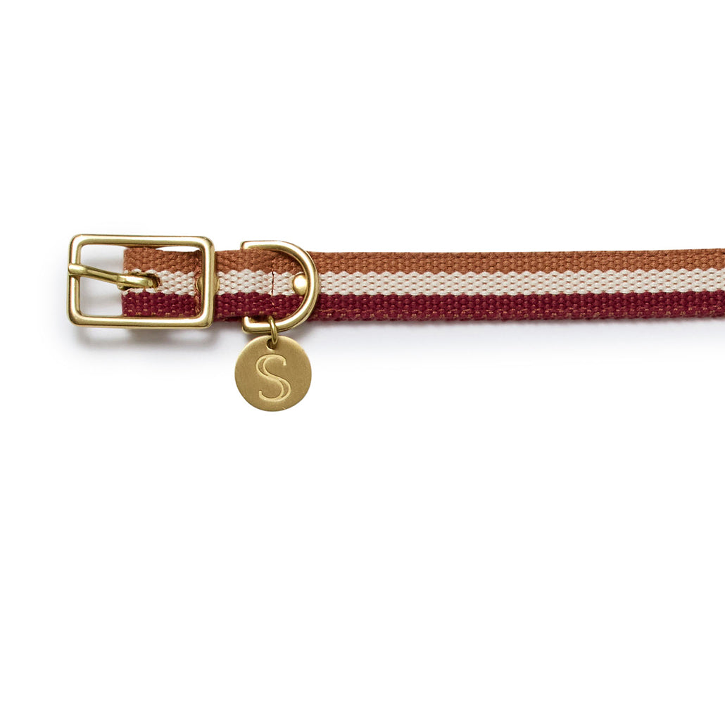 Put your best paw forward, with the retro styling of the Sebastian Says 3-Stripe Collar. A leather alternative suited to the active pooch, the 3-Stripe Collar has been hand crafted by artisans using cotton/nylon webbing, and our signature solid brass hardware and branded SS charm.